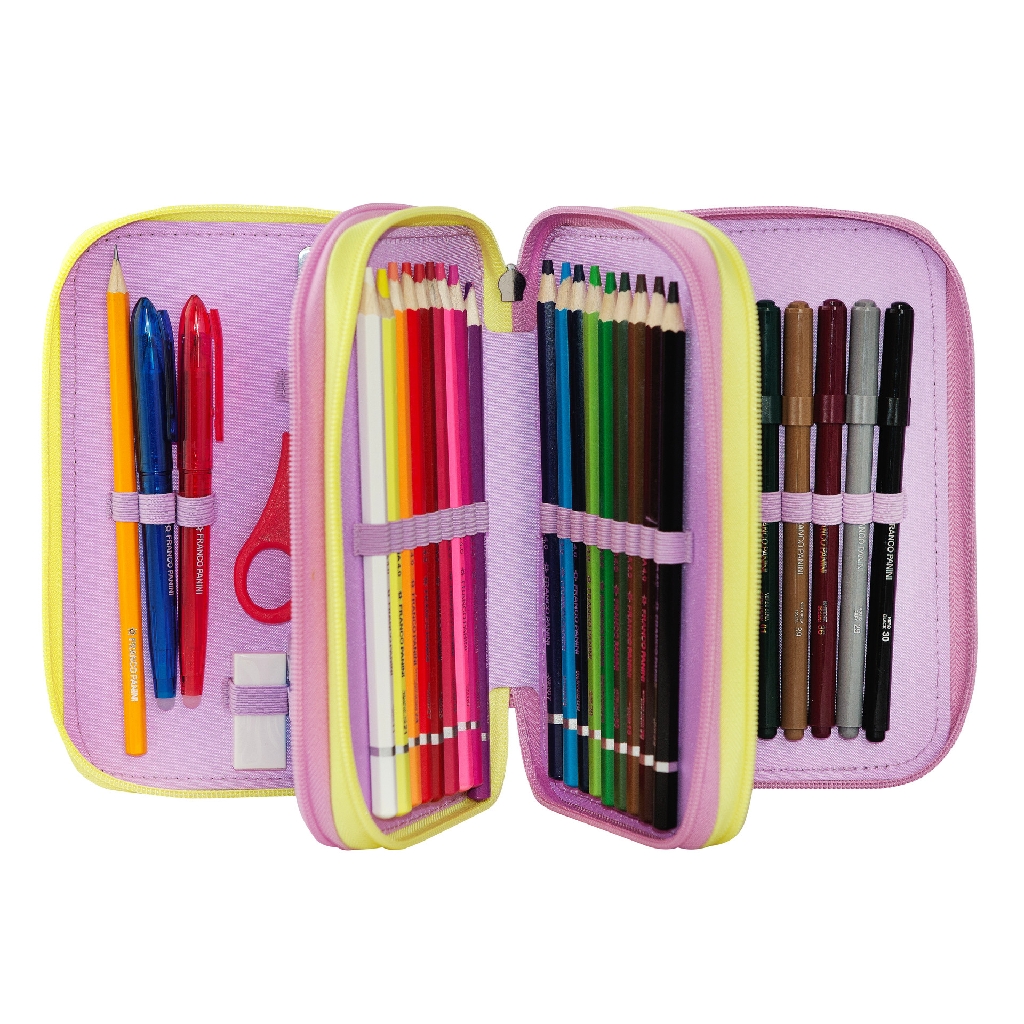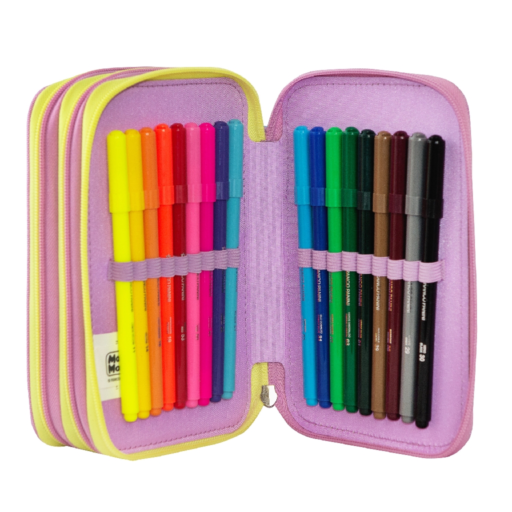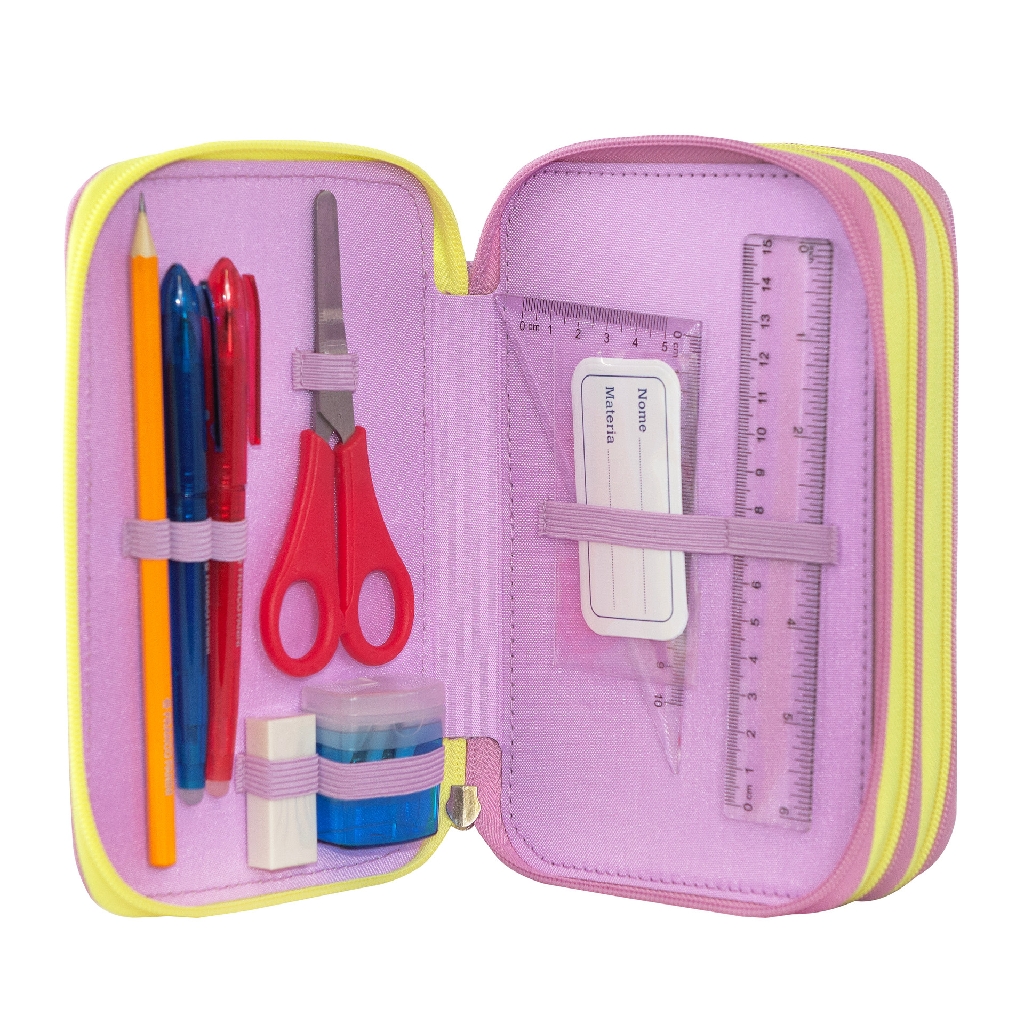 18 matite colorate – 18 pennarelli a punta fine – 1 penna cancellabile blu – 1 penna cancellabile rossa – 1 matita grafite HB – gomma – 1 righello 15 cm – 1 squadra – 1 paio di forbici con punta arrotondata – 1 temperino 2 fori con serbatoio – 5 etichette portanome adesive 7 x 3 cm.
