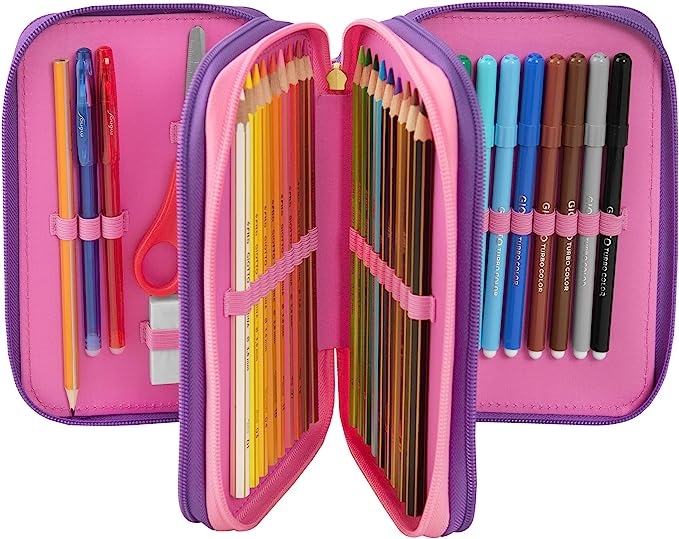CONTIENE: 18 pennarelli, 18 matite colorate, matita, gomma, righello, temperino, forbici con punta arrotondata, goniometro, squadra, evidenziatore, penna rossa e penna cancellabile Frixion blu. Prodotto completo ideale per la cancelleria di bambine e bambini