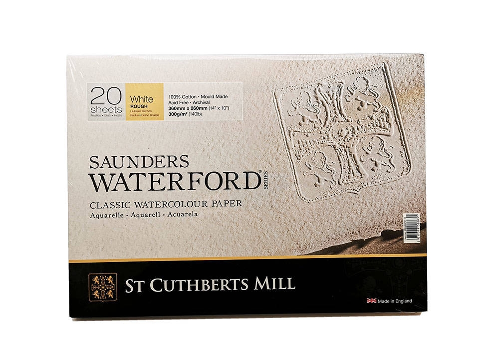 Questo blocco acquerello da 26 cm per 36 cm di Saunders Waterford include 20 fogli di carta ruvida da 60 kg che veniva tradizionalmente prodotta su una macchina per stampi cilindrici in Inghilterra. Caratterizzata da una splendida trama creata utilizzando feltri di lana naturali, questa carta è realizzata utilizzando cotone al 100% che è conforme agli standard di archiviazione. Ogni foglio è inoltre tamponato con carbonato di calcio per aiutare a proteggere il lavoro dallo scolorimento causato dagli acidi nell’aria.