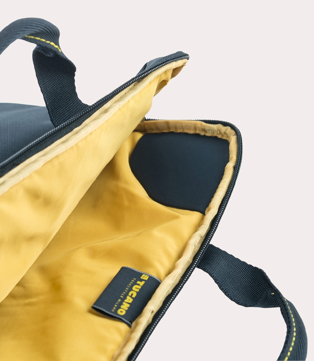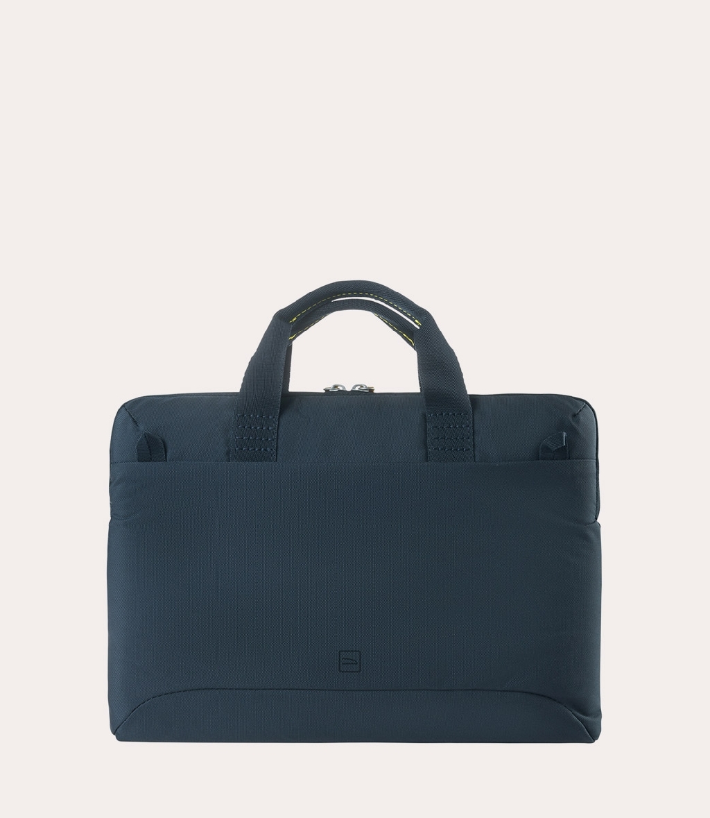 Borsa super slim realizzata in tessuto ottenuto dalla plastica riciclata con dettagli in contrasto colore per Laptop 14″ e MacBook Pro 14″. Vano interno unico con orecchie in neoprene per bloccare il device. Il lato anteriore è dotato di una ampia tasca esterna. Tracolla removibile e manici doppi in nastro.