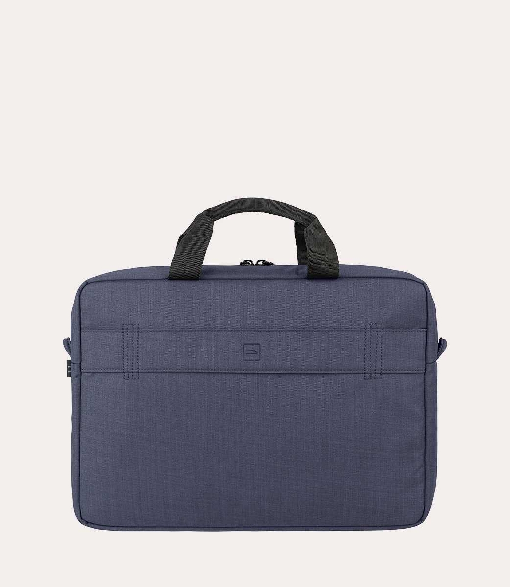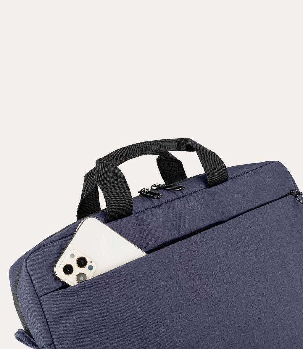 Borsa compatta e leggera per laptop 15.6″ e MacBook Pro 16″, in materiale ottenuto dalla plastica riciclata. Dotata di un comodo vano centrale, la borsa Stop ha una tasca interna per il laptop e una tasca esterna per gli accessori, sulla parte frontale. Dotata di fascia per l’aggancio al trolley e di tracolla rimovibile. DISEGNATO PER