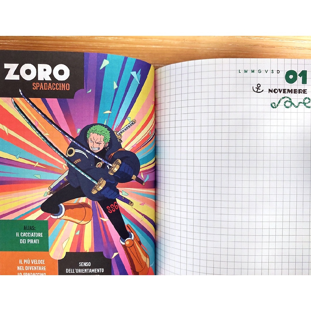 Diario One Piece ufficiale 12 mesi (dal primo settembre al 31 Agosto) per la scuola, realizzato in Italia da Franco Cosimo Panini. Il diario è non datato, ovvero i giorni della settimana devono essere segnati a mano con una crocetta.