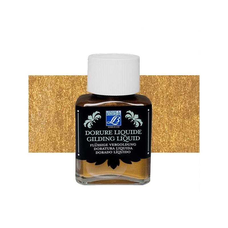 Doratura Lefranc Bourgeois Liquid Gilding Rich Gold 75ml prodotto di alta qualità per la realizzazione di vernici metallizzate e per la doratura uniforme di grandi superfici, a base solvente con pigmenti metallici, i pigmenti offrono colori metallici intensi, cangianti, hanno un’elevata copertura e sono resistenti all’acqua a secco e agli agenti atmosferici , è pronto all’uso e facile è adatto per interni ed esterni e può essere applicato su innumerevoli superfici come carta, legno, argilla, vetro, gesso e metallo.Il flacone deve essere agitato bene prima dell’uso ed eventualmente mescolato con un pennello per rimuovere i pigmenti metallici per miscelarli, durante l’applicazione i pigmenti devono essere distribuiti uniformemente con il pennello, prima di una seconda applicazione lo strato inferiore deve essere completamente asciutto, gli oggetti in vetro e plastica possono essere lavati via 24 ore dopo che si sono completamente asciugati, decorati gli oggetti non sono adatti al cibo
