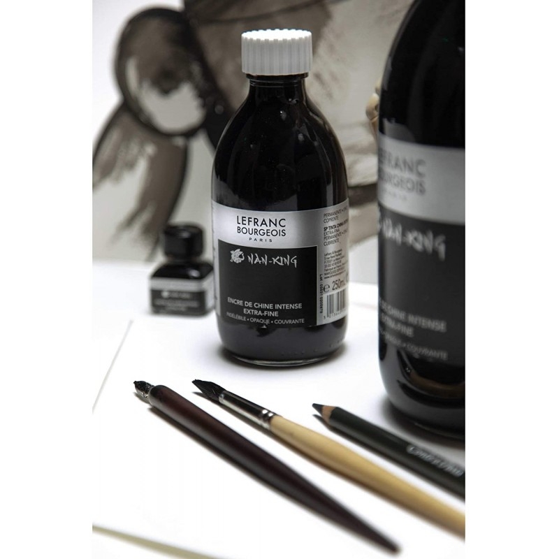 Inchiostro di china Nan-King di LEFRANC & BOURGEOIS, Colori trasparenti. Sono impermeabile una volta asciutti e possono essere applicati l’uno sull’altro dopo l’essiccazione. Si possono così creare interessanti effetti di trasparenza. I colori sono diluibili con acqua e tutti miscibili tra loro. Adatti per aerografo anche non diluiti.