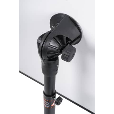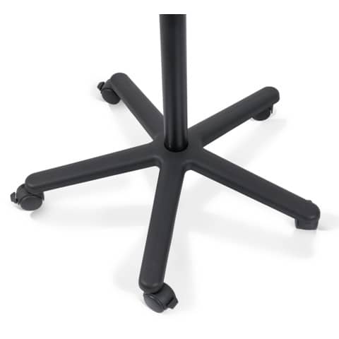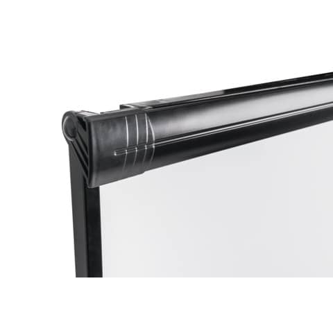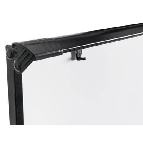 Solido cavalletto con cornice in alluminio montato su base mobile. Superficie in acciaio laccato cancellabile a secco. Il pannello presenta altezza e angolazione regolabili per aiutare il presentatore. Base mobile stabile con 5 rotelle bloccabili. Morsetto regolabile per fogli, compatibile con qualsiasi blocco di carta per lavagna a fogli mobili. Cornice in alluminio grigia (1000 x 700 mm). Vassoio portapenne a lunghezza intera. Peso 18,5 kg, in Melaminico.