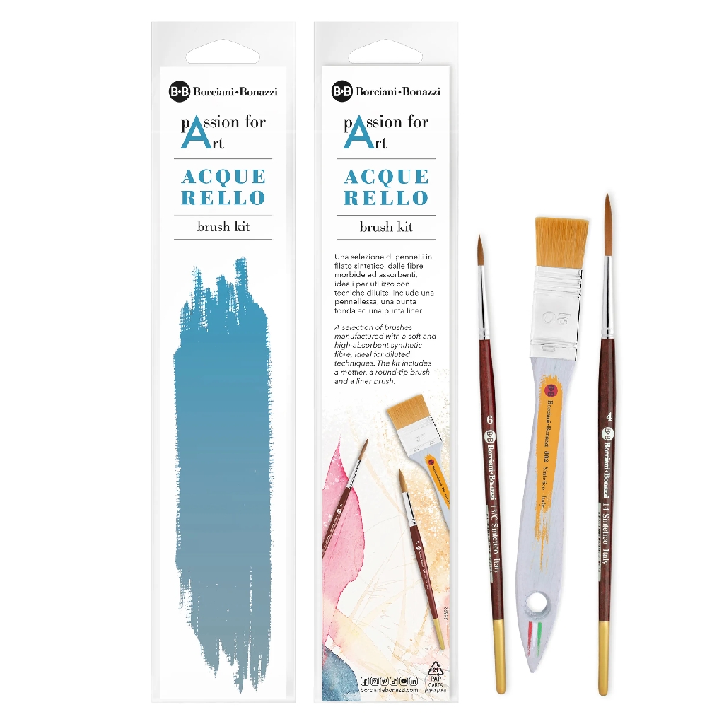 Contiene una selezione di 3 pennelli in filati sintetici dalle fibre morbide e sottili, a lento rilascio d’acqua che permettano lavorazioni su carta bagnata senza graffiarla e tratti lunghi e definiti.