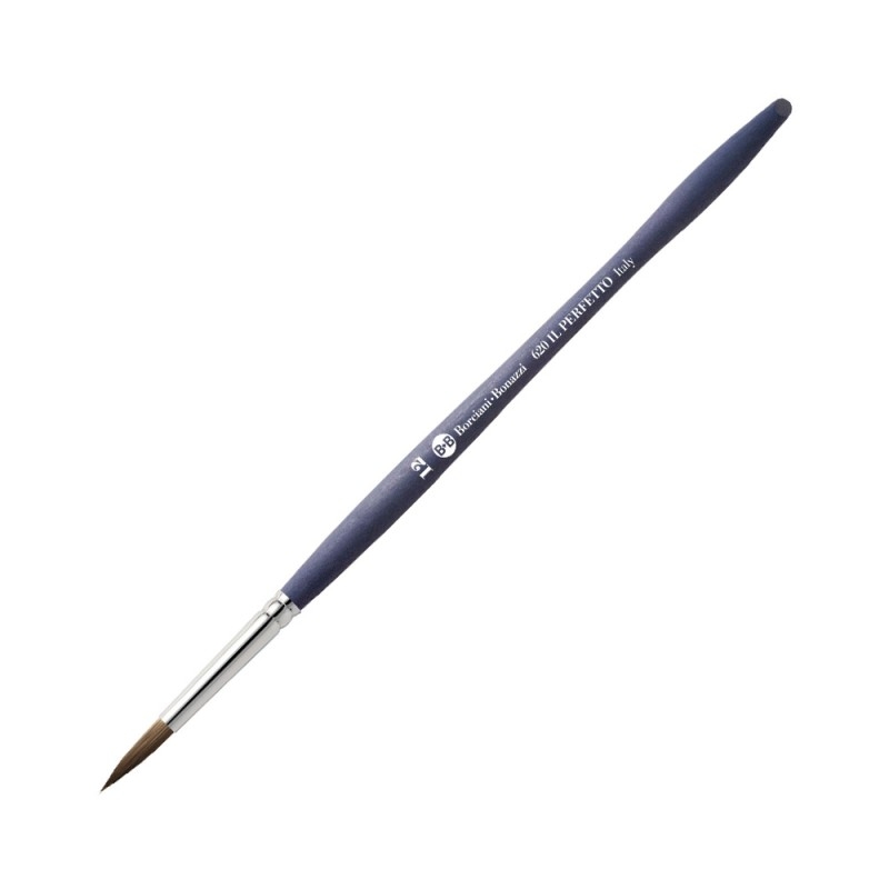 PENNELLO MARTORA SINTETICA TONDO “IL PERFETTO” MANICO CORTO BILANCIATO BORCIANI & BONAZZI – Pennello a punta tonda in filato sintetico imitazione Martora Kolinsky con manico corto in legno di betulla con verniciatura atossica ecologica all’acqua, in colore grigio di Payne e ghiera in ottone nichelato. Serie 620 pennello tondo PERFETTO per: