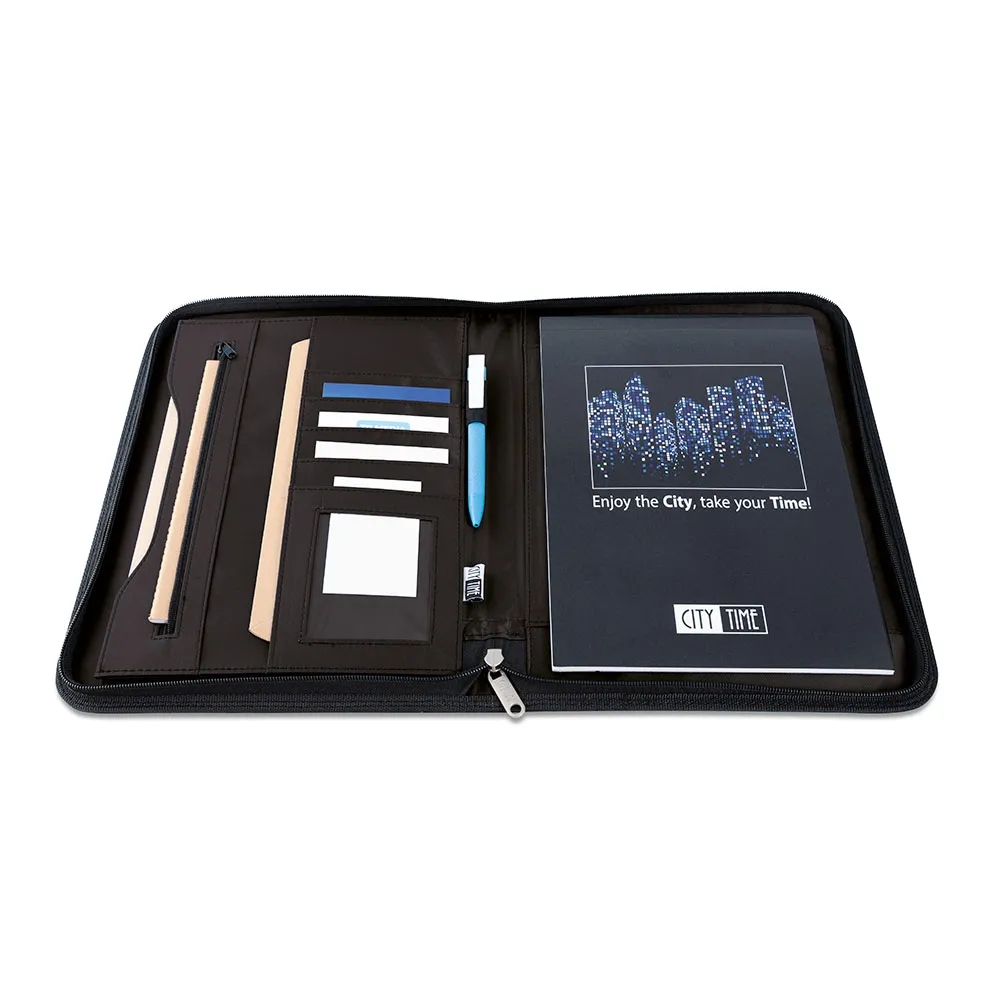 Portablocco A4 linea CITY in eco-pelle, chiusura con zip, tasca interna con zip, scomparti per biglietti, tasca interna portadocumenti, portapenna, completo di blocco. Dimensioni 24,5 x 33 cm.
