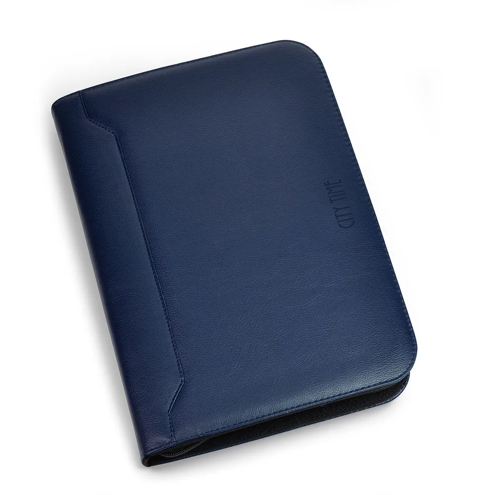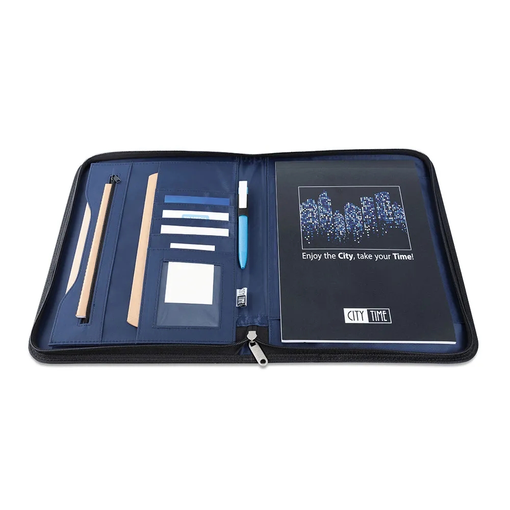 Portablocco A4 linea CITY in eco-pelle, chiusura con zip, tasca interna con zip, scomparti per biglietti, tasca interna portadocumenti, portapenna, completo di blocco. Dimensioni 24,5 x 33 cm.