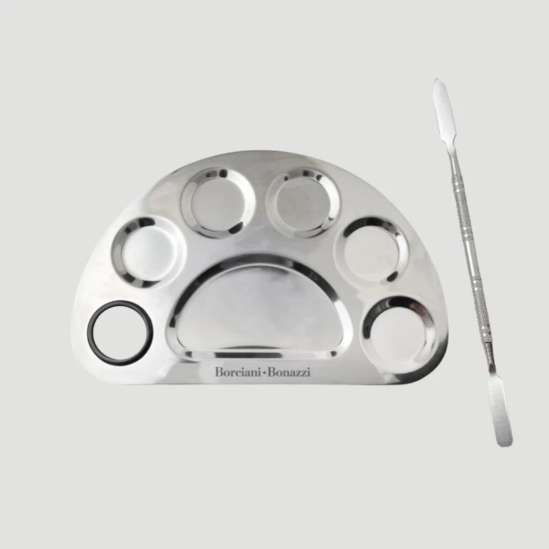 Tavolozza a Mezzaluna in Acciaio Borciani e Bonazzi, formato 16x10cm. Ideale per chi cerca praticità e durata. Grazie alla sua resistenza alla corrosione e alla facilità di pulizia, è perfetta per mescolare ogni tipo di colore, dai toni acrilici agli oli, mantenendo i colori vivaci e senza residui. La tavolozza viene venduta insieme a una spatola.