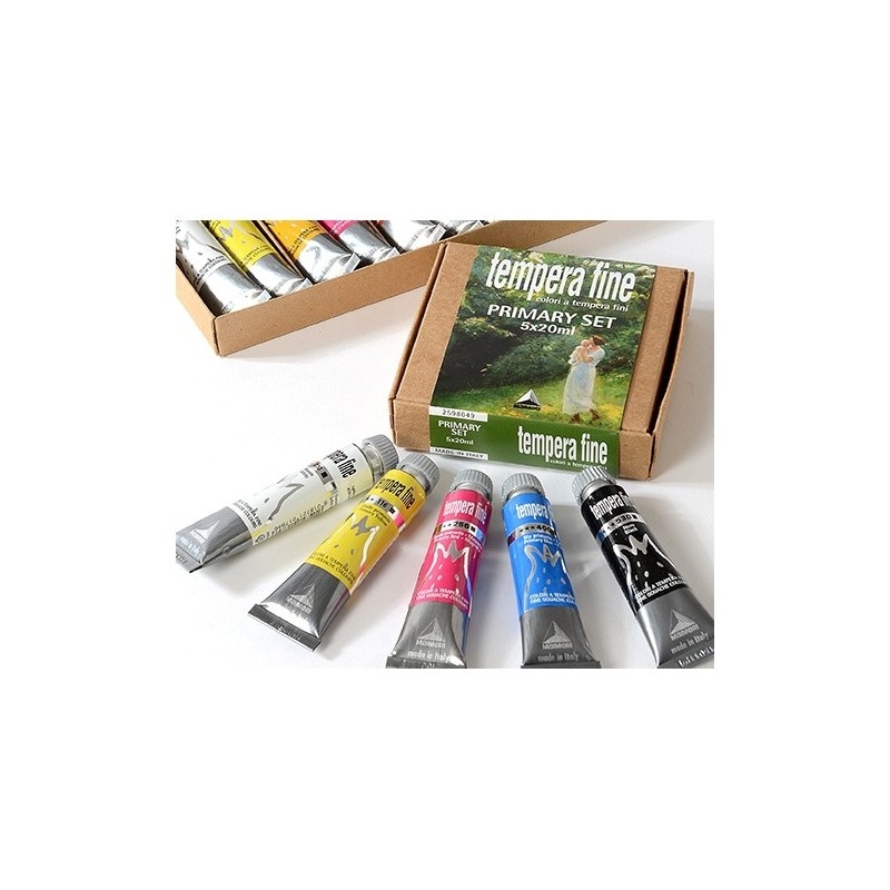 Confezione in cartone con 5 tubi da 20ml di colori a tempera primari: Bianco, Giallo primario, Rosso primario, Blu primario, Nero. Colori a tempera fini Tempera Fine è una gamma di colori a tempera che copre l’intero arco di applicazioni di questa tecnica specifica. Versatile, agile, è “Tempera” nel senso più classico. La linea è studiata con grande duttilità per il lavoro di studenti, amatori e professionisti. Particolarmente meditata l’armonizzazione della scala cromatica che consente un equilibrato rapporto tonale in tutto l’arco della tavolozza. La totale inalterabilità del legante consente reversibilità e conservazione di toni e colori ineccepibili nel tempo. 27 tinte, 3 colori metallici, in equilibrio cromatico perfetto.