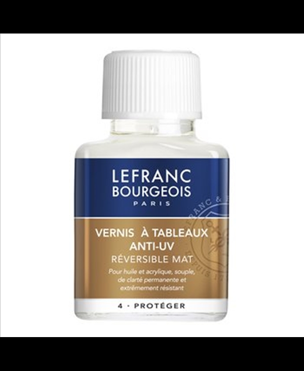 LEFRANC BOURGEOIS VERNICE FINALE ACRILICO OPACO ANTI UV FLACONE 75 ML vernice finale per olio, acrilico o tempera. vernice morbida,di chiarezza permanente e estremamente resistente. e’miscibile, in qualsiasi misura, con le vernici per ritocco e lavernice opaca dammar. mescolandola a queste due vernici,si può ottenere l’effetto satinato desiderato, senza che i coloriperdano di vivacità.vernice fluida, si stende facilmente ed essicca molto velocemente.conserva una certa morbidezza senza ingiallire. e’composta da resina tonica e acrilica.nuova formu